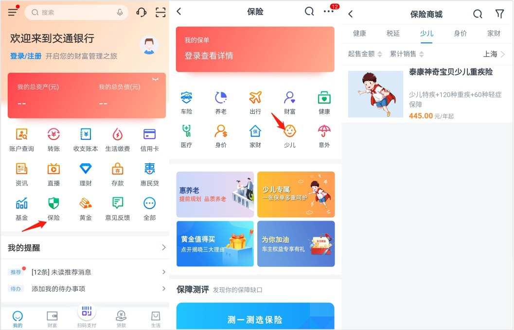 如今,泰康神奇宝贝重疾险在交通银行APP上线,只要登陆交通银行APP,再依次点击我的——保险——少儿,就可以找到并直接购买,操作简单明了,非常方便。