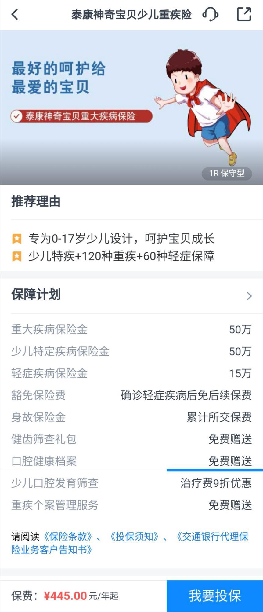 患了少儿重疾不仅影响孩子的身心健康,高昂的治疗费用更是对家庭造成了很大的压力。但如果有一份保障充足的少儿重疾保险,就可以很好地帮助有孩家庭规避少儿重疾带来的风险。为此,很多保司也都推出了少儿重疾险,给家长们提供了不少选择。如泰康人寿最近推出的“泰康神奇宝贝重大疾病保险”,在交通银行APP上线后就引起了巨大反响。